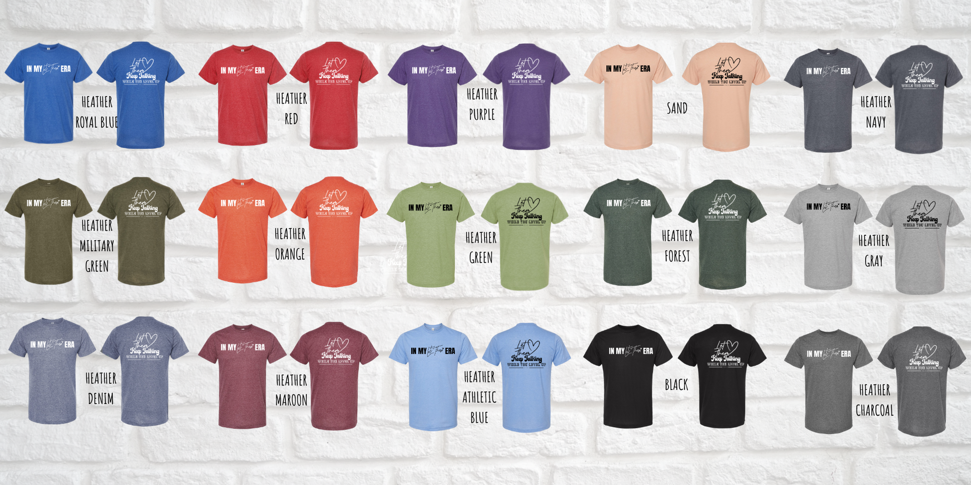 Heather Royal Blue • Heather Red • Heather Purple • Sand • Heather Navy • Heather Military Green • Heather Orange • Heather Green • Heather Forest • Heather Gray • Heather Denim • Heather Maroon • Heather Athletic Blue • Black • Heather Charcoal