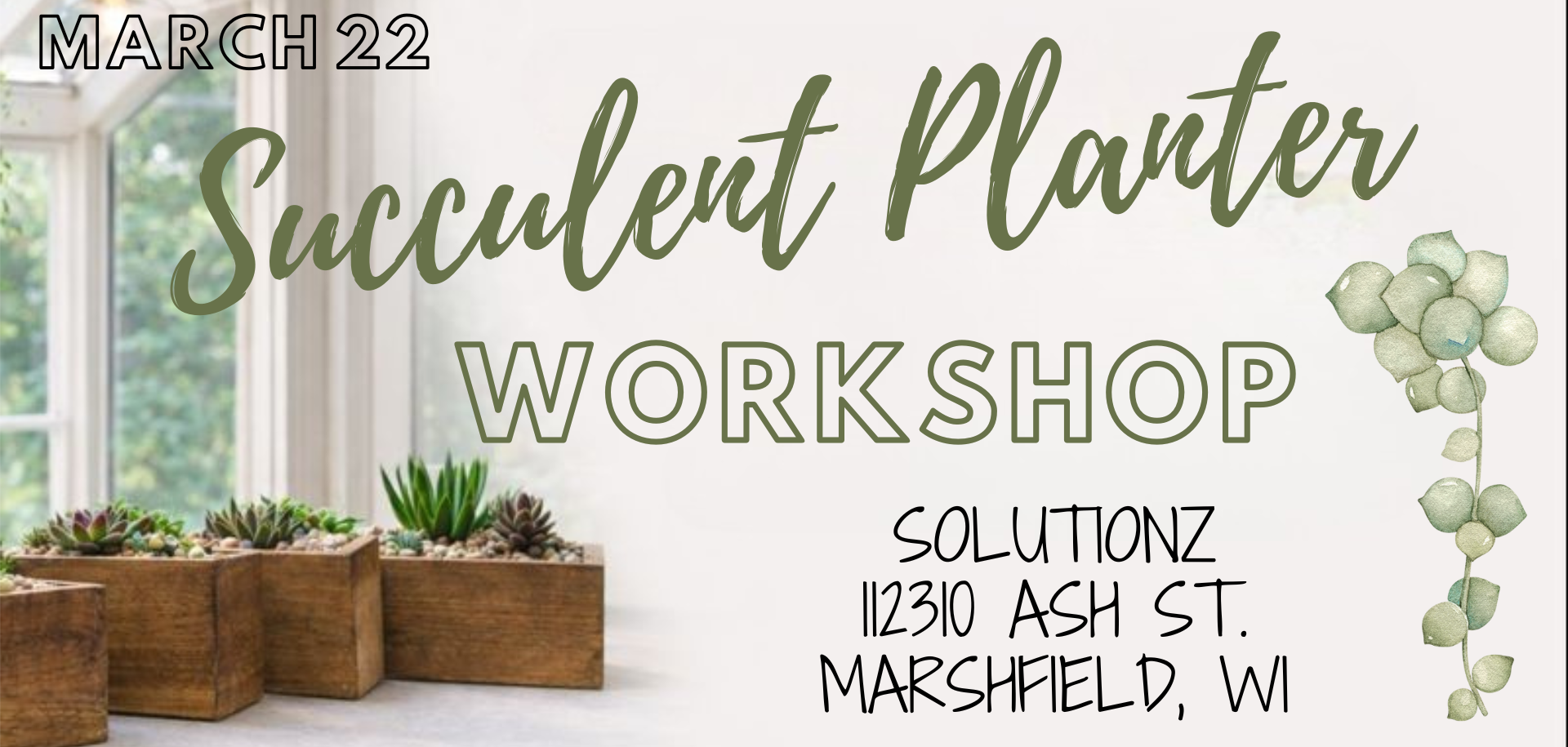 Looking for a fun and creative way to spend your Sunday? Join us on Sunday, March 22 in Marshfield, WI, for a hands-on Succulent Planter Workshop at Solutionz, starting at 1:00pm!